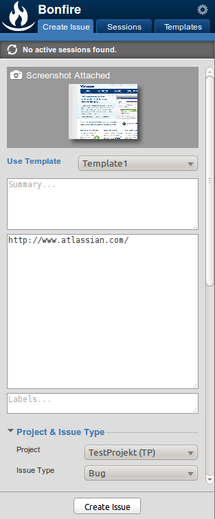 • Durch einen Mausklick auf das Capture-for-JIRA-Symbol im Browser wird parallel zur angezeigten Seite ein Dialog zur Anlage neuer Vorgänge angezeigt