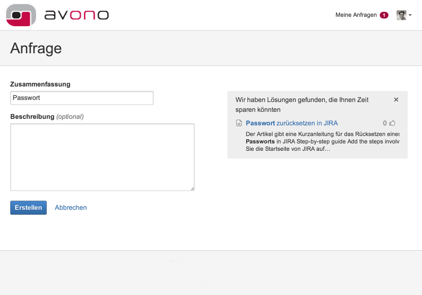 Optional kann für den Service Desk eine Wissensdatenbank angebunden werden. Dazu wird ein Bereich (Space) in Confluence mit dem Service Desk verknüpft. Um zielgerichtet Artikel aus dem Wiki anbieten zu können, ist es möglich, die verschiedenen Anfragetypen im Service Desk mit unterschiedlichen Schlagwörtern (Stichworte an den Wikiseiten) zu assoziieren.