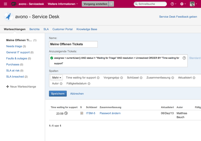 Unter Verwendung der JIRA-eigenen Abfragesprache JQL (JIRA Query Language) werden die Tickets automatisch in die passenden Queues eingetragen. Die Queues müssen somit nicht manuell von den Mitarbeitern des Service Desk gepflegt werden. Tickets, die die Kriterien einer Queue erfüllen, werden automatisch in diese aufgenommen. Durch die Verwendung der Queues, die direkt in die Oberfläche von JIRA Service Desk integriert sind, wird sichergestellt, dass alle Mitarbeiter des Service Desk immer die gleiche vollständige Sicht auf die anstehenden Aufgaben haben. Die Queues geben darüberhinaus auch einen Reihenfolge für die Bearbeitung der Anfragen vor, so dass dringende hoch priorisierte Anfragen nicht in der Flut der Anfragen untergehen, sondern gut sichtbar gemacht werden können.