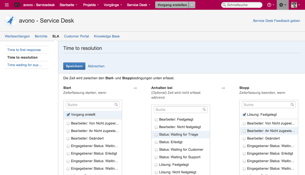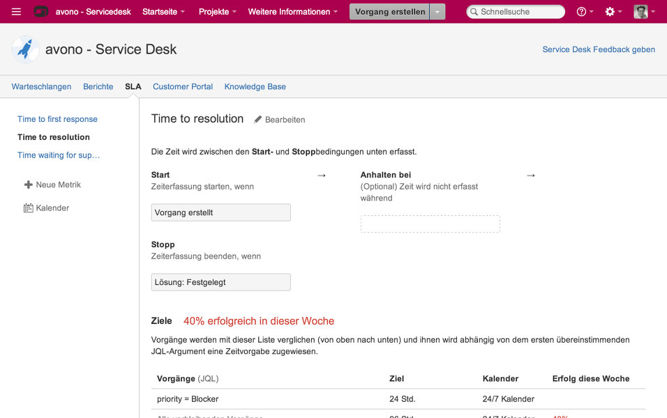 Die durch die SLAs vorgegebenen Rahmenbedingungen für die Bearbeitung der Anfragen werden den Mitarbeitern des Service Desk in der Darstellung der Vorgänge angezeigt. Über eine Ampelnotation wird hier schnell ersichtlich, ob die Vorgaben eingehalten wurden, eine Verletzung droht oder die vereinbarten Fristen überschritten wurden. Die Oberfläche des JIRA Service Desk bietet für die Mitarbeiter auch eine Übersicht der definierten SLAs mit den zugrundeliegenden Bedingungen. Über eine intuitive Oberfläche können die vorhandenen SLAs gepflegt und weitere ergänzt werden. Bei der Einführung von JIRA Service Desk werden die definierten SLAs auch retrospektiv auf bereits vorhandene Anfragen in JIRA angewendet.
