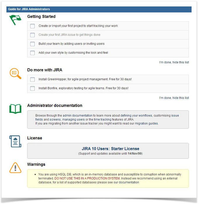 Das Setup einer JIRA Instanz hat sich durch das neu eingeführte Administration-Gadget ebenfalls stark vereinfacht. In einem einfachen Dialog können nun die wichtigsten Einstellungen gesetzt werden, einmal Speichern und los gehts!