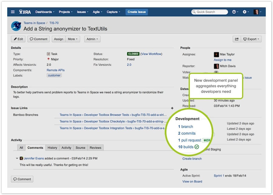 JIRA 6.2 bietet über das neue Entwicklungs-Panel eine bessere Integration von entwicklungsrelevanten Informationen und Aufgaben direkt am Vorgang an. Über dieses Panel können zu jedem Vorgang Branches, Commits, Pull-Requests, Reviews und der Status von Builds und Deployments angezeigt werden. In Abhängigkeit der in JIRA eingebundenen Entwicklungswerkzeuge (Bitbucket, Stash, GitHub, FishEye/Crucible und Bamboo) können Branches, Pull-Requests und Reviews dabei auch direkt angelegt werden.