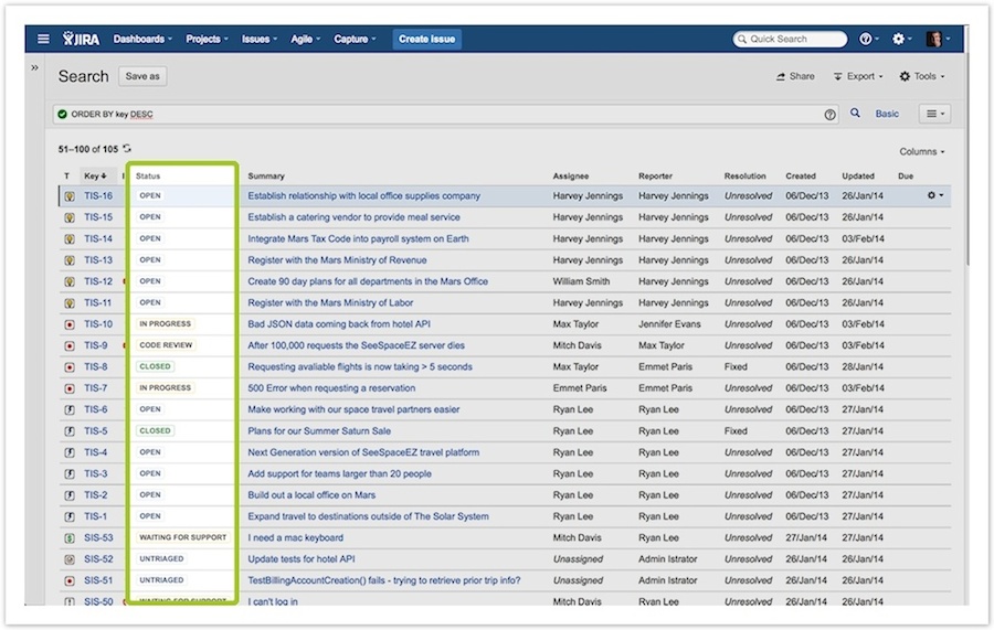 Die Darstellung der Status-Indikatoren wurde den Atlassian Design Styleguides angepasst: Anstelle des bisherigen Status-Icons mit einer Kombinationen aus Grafik und Textinformationen werden jetzt farbliche Status-Indikatoren verwendet. Durch die Unterteiltung in Arbeitsphasen und die farbliche Kennzeichnung (Offen – Blau, In Arbeit – Gelb und Fertig – Grün) wird eine schnellere Übersicht ermöglicht.