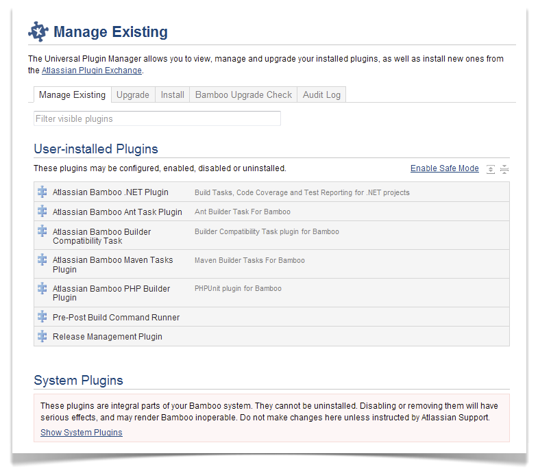 Wie von JIRA und Confluence gewohnt, wird Bamboo 3.1 nun ebenfalls mit dem Universal Plugin Manager (UPM) ausgeliefert. Plugins für Bamboo können dadurch einfach per Mausklick vom Atlassian Plugin Exchange heruntergeladen, installiert und aktualisiert werden.