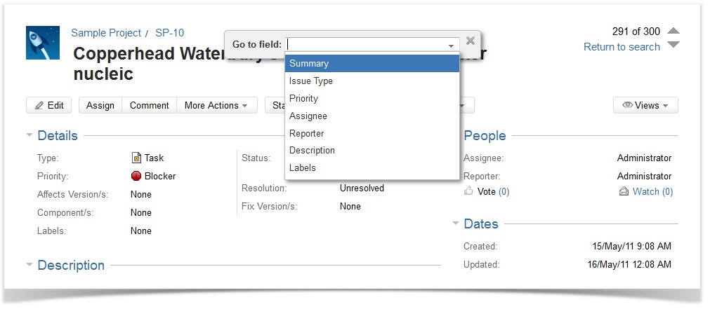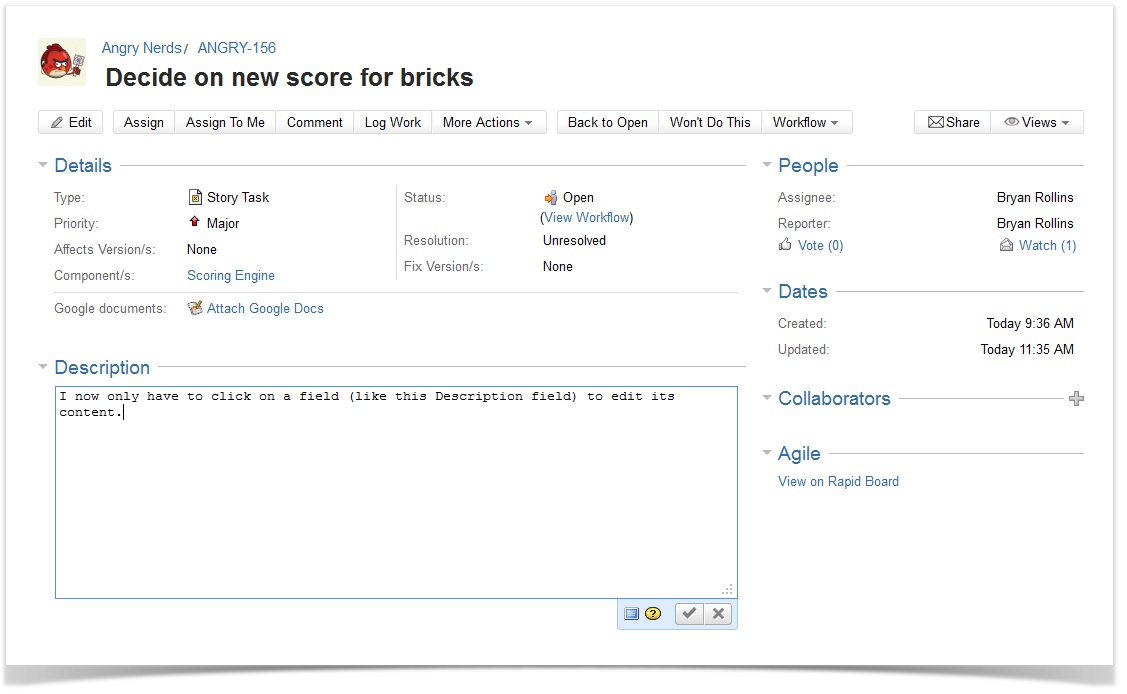Vorgänge lassen sich in JIRA sowohl von mobilen Geräten als auch per E-Mail, von Drittanwendungen, oder aus der JIRA Web-Oberfläche heraus erstellen. Hierbei werden oftmals nur die am häufigsten benötigten Informationen erhoben. Um die Bearbeitung der Felder eines Vorganges zu einem späteren Zeitpunkt noch effizienter und intuitiver zu gestalten, können Feldinhalte direkt angeklickt und dann bearbeitet werden (Inline-Editing). Änderungen werden hierbei ohne Seiten-Reload übernommen.