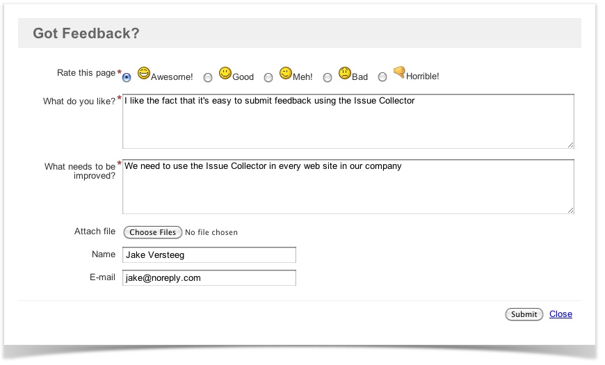Der neue Issue Collector ermöglicht es, einen individuellen Button in eine Website oder Web-Anwendung zu integrieren, um ein Feedbackformular zur Verfügung zu stellen. Für das Formular stehen Standardvorlagen zum Abgeben von Feedback oder zum Melden von Bugs zur Auswahl. Die Maske des Formulars kann aber auch kundenspezifisch angepasst werden. Nach dem Abschicken eines ausgefüllten Formulars, wird automatisch ein Ticket in JIRA erstellt. Somit stellt der Issue Collector eine flexible Möglichkeit dar, Feedback oder Bugreports zu sammeln, ohne dass der Absender des Formulares einen JIRA Account besitzen muss.
