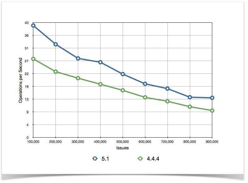 Mit der aktuellen Version 5.1 wurden Performanceverbesserungen insbesondere auch für JIRA-Instanzen mit einer großen Anzahl an Vorgängen und Benutzern vorgenommen. Die Performancesteigerungen beziehen sich auf die gesamte Kernfunktionalität von JIRA, vom Erstellen und Bearbeiten von Vorgängen bis hin zu komplexen Suchanfragen. Die unten stehende Grafik verdeutlicht die Performanceverbesserungen von JIRA 5.1 im Vergleich zu JIRA 4.4, abhängig von der Anzahl der vorhandenen Vorgänge.