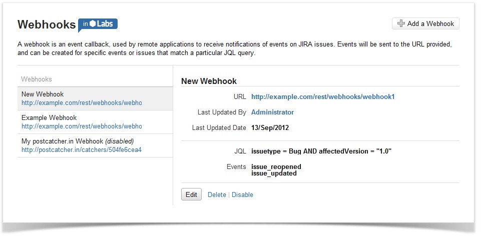 JIRA erlaubt die Konfiguration von Webhooks, um Push-Nachrichten an Remoteanwendungen zu senden. So ist es z.B. möglich, ein Testmanagementsystem über Änderungen an Vorgängen des Typs Bug zu informieren. Für die Einrichtung eines Webhooks wird lediglich ein Name und die URL der Remoteanwendung benötigt, an welche die Nachrichten gesendet werden sollen. Über Folgefunktionen im Arbeitsablauf oder anhand von Ereignissen (z.B. Vorgang erstellt) werden die Nachrichten verschickt.
