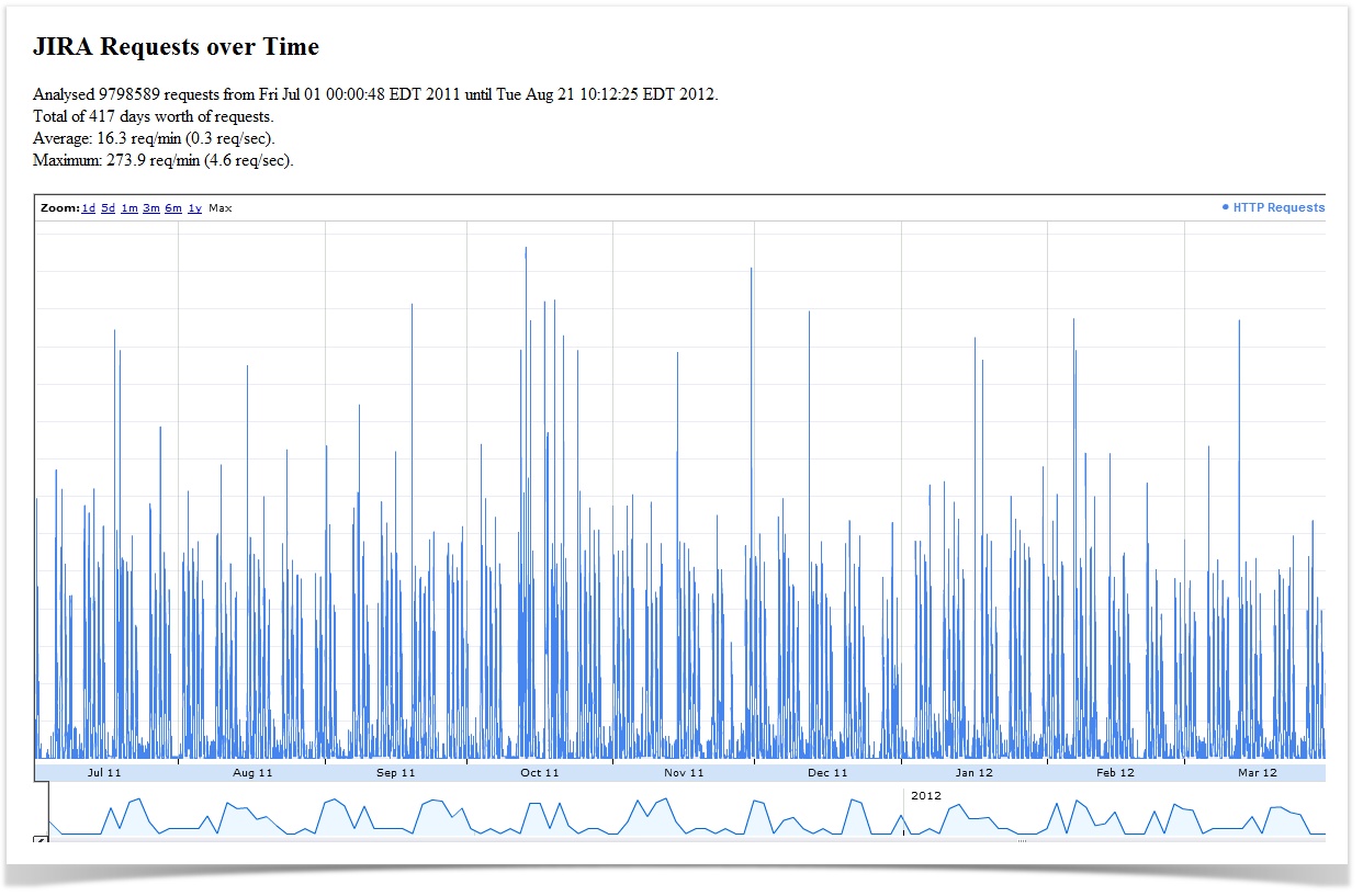 Zur Auswertung von Log-Dateien der JIRA-Installation ist ein externes Werkzeug entwickelt worden. Anfragen an JIRA werden kategorisiert dargestellt, was Rückschlüsse auf die von Performance-Engpässen betroffenen Komponenten zulässt.