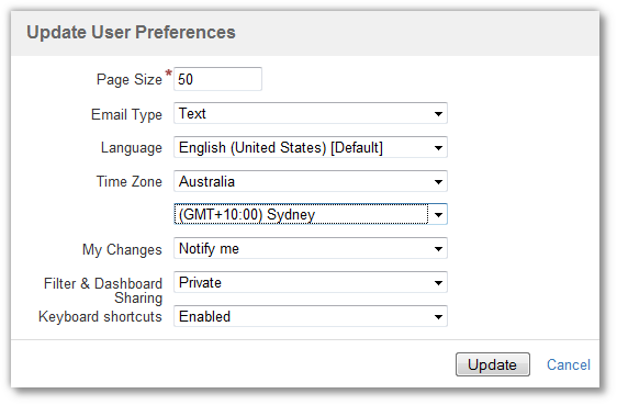 Aber auch für die Endnutzer bieten die aktuellen Testversionen nützliche Neuerungen. Neben der Visualisierung des Workflows für einen Vorgang, ist hier nun besonders die Unterstützung für benutzerabhängige Zeitzonen zu erwähnen. Bisher wurden die Datumsfelder immer in der Zeitzone des Servers auf dem Jira läuft angezeigt. Gerade bei verteilten Teams mussten einige Teammitglieder die Datums- und Zeitangaben immer manuell umrechnen. Mit den benutzerdefinierten Zeitzonen übernimmt Jira dies und zeigt die Informationen in der lokalen Zeit des Nutzers an.