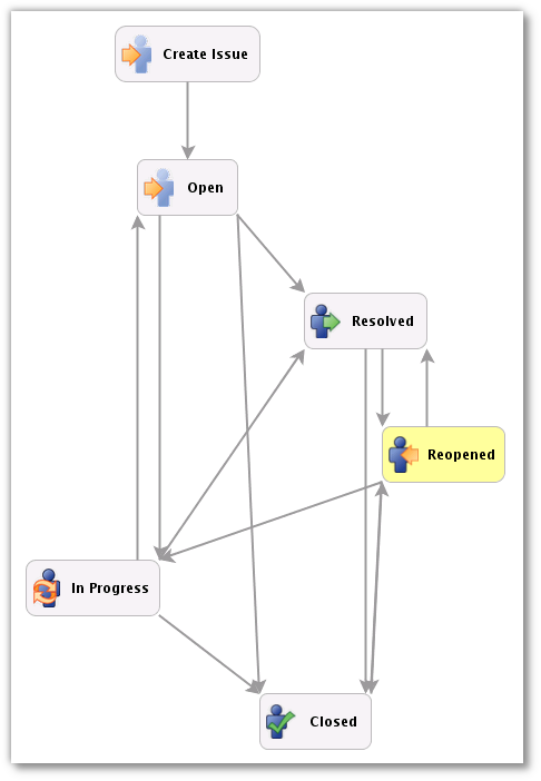 Die Funktionalität des Workflow Designers wird allerdings nicht nur im Bereich Administration genutzt; sie steht auch den Nutzern von Jira zur Verfügung. So kann für einzelne Vorgänge ein Bild des hinterlegten Workflows angezeigt werden, um die weiteren Schritte und den aktuellen Stand kenntlich zu machen.