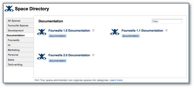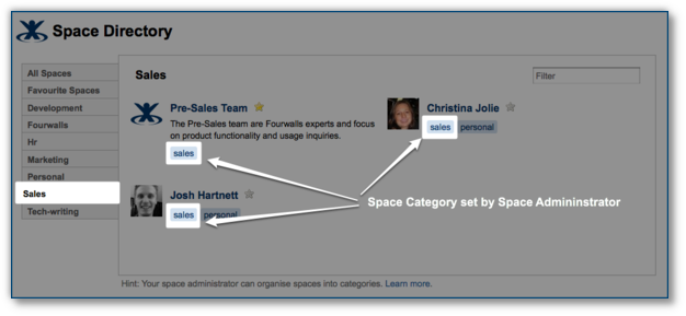Erreichbar über das Browse Menü, können sich Benutzer im Space Directory Spaces nach Kategorien anzeigen lassen und Spaces zu ihren Favoritenlisten hinzufügen.