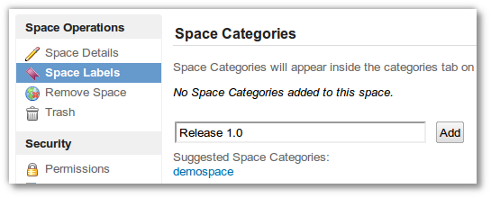 Kategorien werden in der Benutzermaske „Space labels" eingerichtet, welche über das Browse Menü über den Menüpunkt „Space Admin" geöffnet wird.