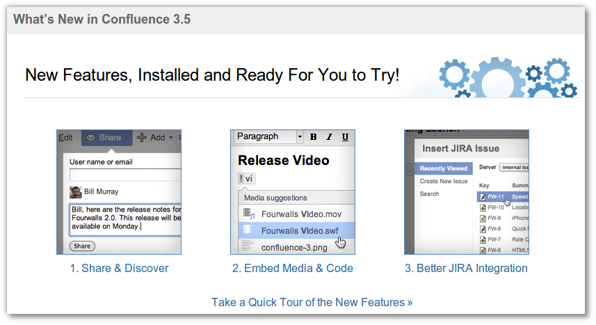 Nach dem Upgrade auf Confluence 3.5 kann dem Benutzer beim ersten Login ein Popup mit den Neuerungen angezeigt werden. Dieses neue Feature hilft, dass neue Feature schneller Verwendung finden und somit die Produktivität im Umgang mit Confluence erhöht wird.
