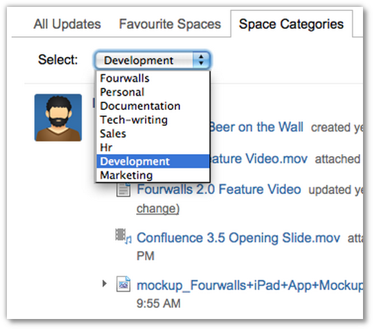 Die letzten Änderungen im Wiki lassen sich jetzt nach „All Updates", "Favourite Spaces" und „Space Categories" filtern.